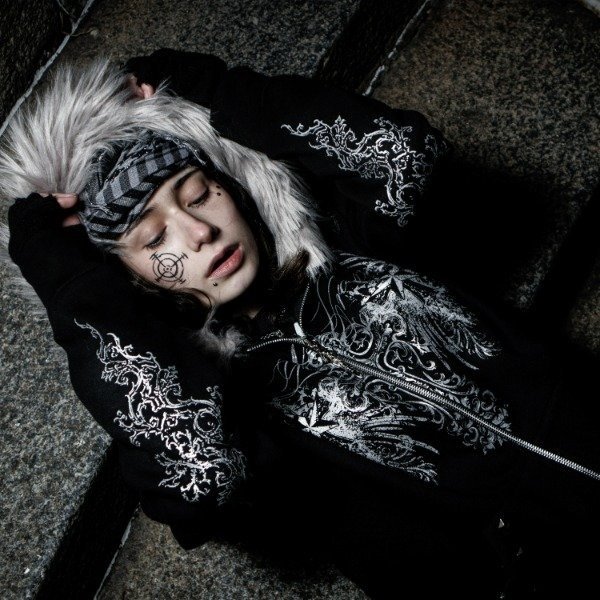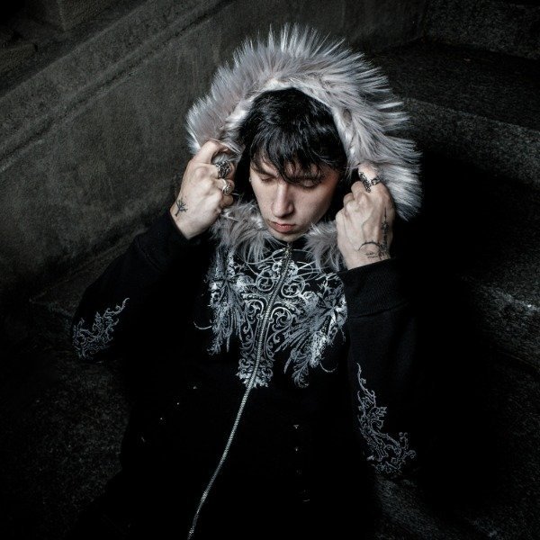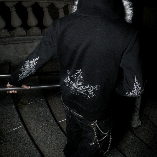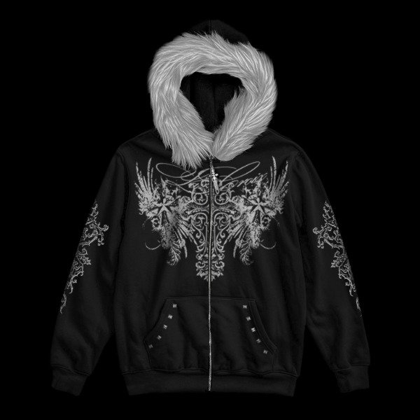 ✠ Campera de frisa invisible, piel sintética importada añadida, tachas de acero inoxidable, estampado plateado brillante en frente, espalda y brazos, cierres metálicos YKK con dije de espada y cruz de acero.